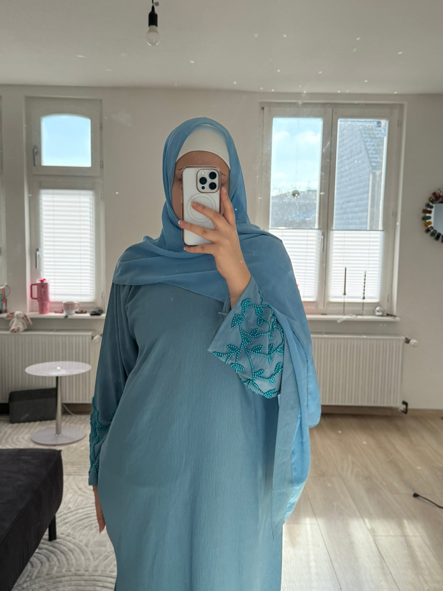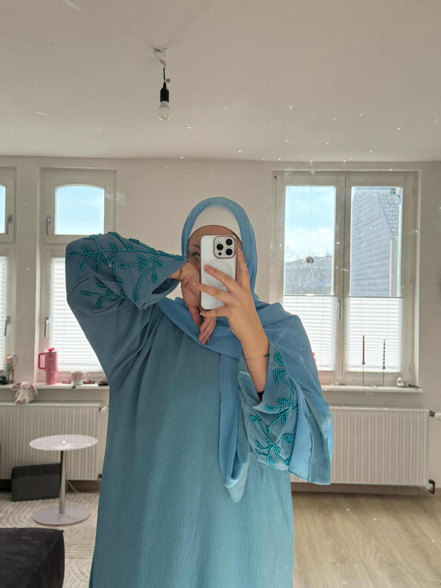 Die Abaya „Nadja“ überzeugt durch ihre sanfte Farbgebung und den hochwertigen Crêpe-Stoff, der für ein angenehmes Tragegefühl sorgt. In einem beruhigenden Hellblau gehalten, verleiht diese Abaya der Trägerin eine ruhige und elegante Ausstrahlung. Der fließende Schnitt und die zarte Struktur des Crêpe-Stoffs sorgen für einen perfekten Fall, der jeder Figur schmeichelt.